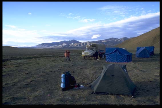 Tibet - Strasse 209 auf dem Weg nach Lhasa eine traumhafte Landschafte mit kräftigem Morgenreif auf dem Zelt