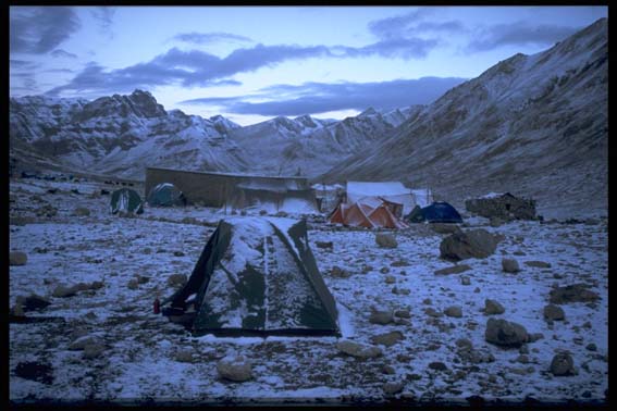 Tibet - Kailash 1 auf der Kora am Dirapuk Gompa morgens um 8 Uhr (5200 müNN) Schnee gab es in diesem Sommer immer wieder