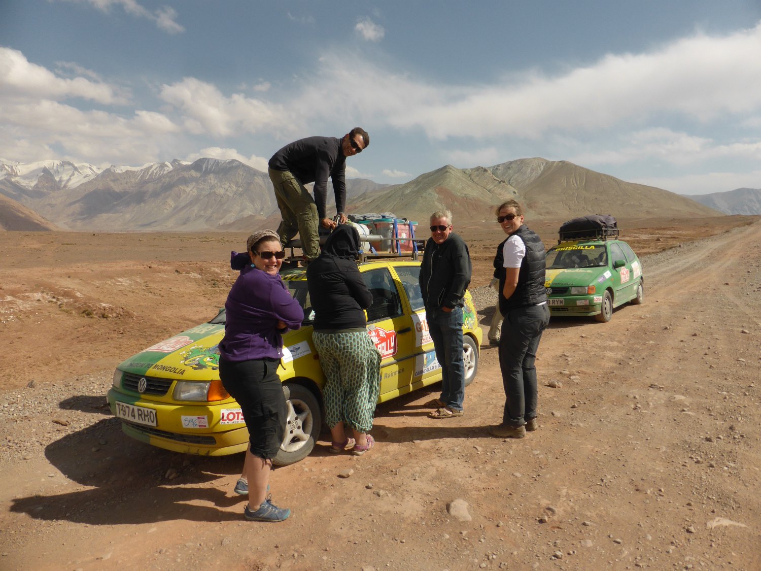 ... Teilnehmer der London Mongolei Ralley geben mir Wasser ab ...
